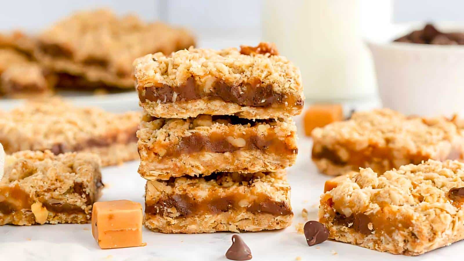 A stack of three caramel oatmeal bars is placed on a white surface, surrounded by additional bars, caramel squares, and chocolate chips. A glass of milk and a bowl of chocolate chips are in the background.Pin